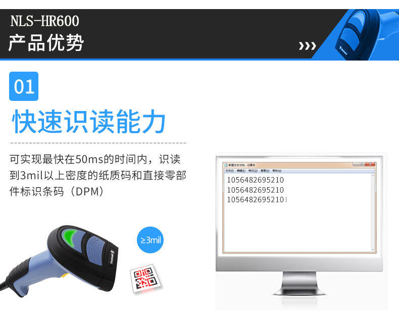 新大陸NLS-HR600可實現*快在50ms的時間內,識讀到3mil以上密度的紙質碼和直接零部件標識條碼(DPM)