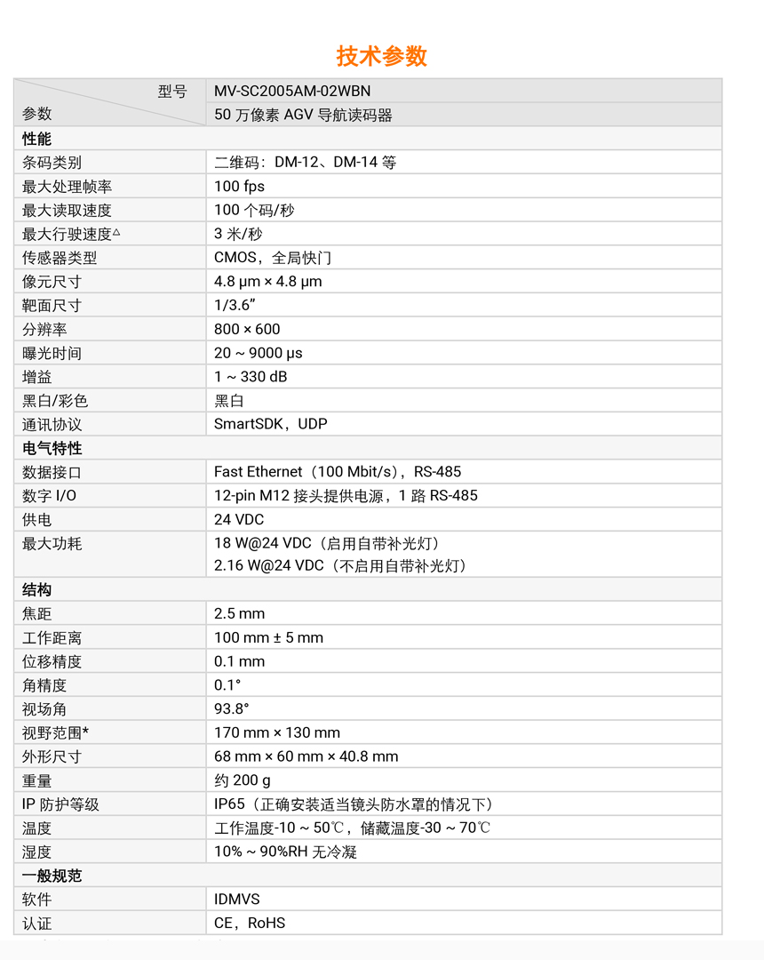 海康MV-SC2005AM 型號(hào)AGV 導(dǎo)航讀碼器內(nèi)置讀碼算法,可有效讀取 DM-12 和 DM-14 等碼制,最大讀取速度達(dá) 100 個(gè)碼/秒。算法魯棒性強(qiáng),可有效應(yīng)對(duì)條碼臟污、缺損、低對(duì)比度的情形。廣泛應(yīng)用于 AGV 小車導(dǎo)航場(chǎng)景。